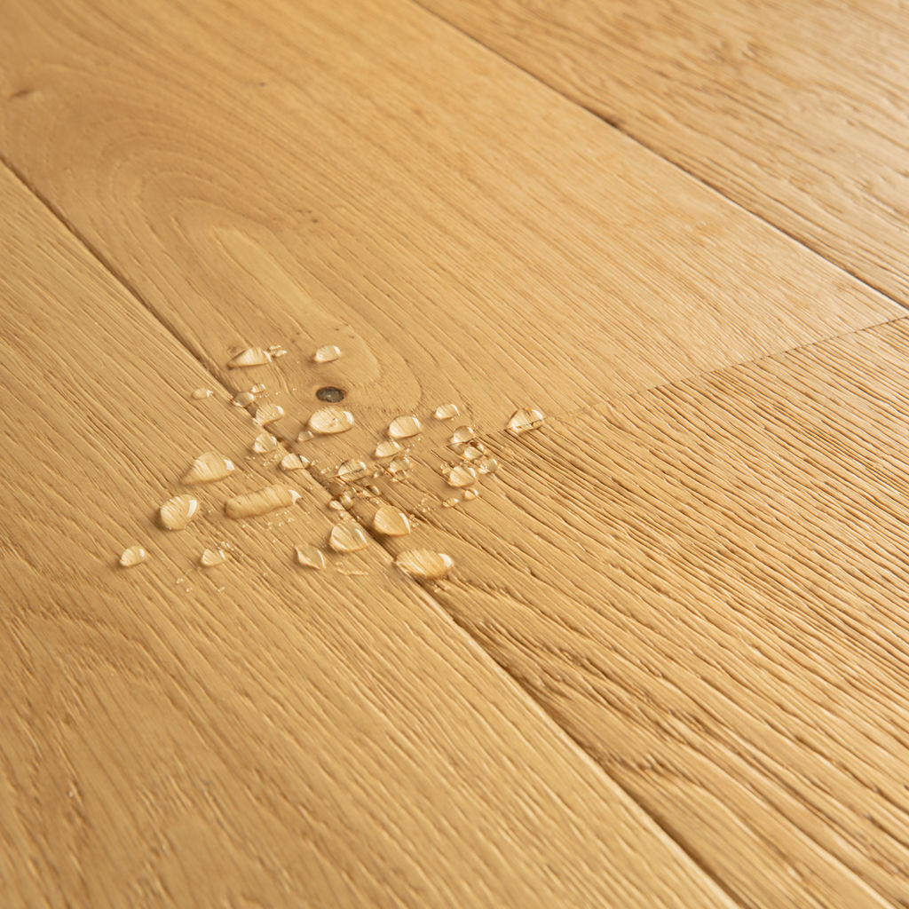 La technologie hydrofuge ‘Wood for Life’ permet d’empêcher que de la boue, des aliments renversés et d’autres saletés se coincent dans les joints et la structure du bois. Cela permet de maintenir votre sol comme neuf.